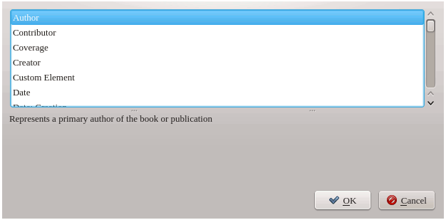 Creator 아이템에 File-As 속성을 추가한다. 이는 선택사항으로서, 저자명을 정렬하는 방식을 지정한다. 우측의 속성 추가(Add Property)를 클릭하고 File-As 속성을 선택한다.