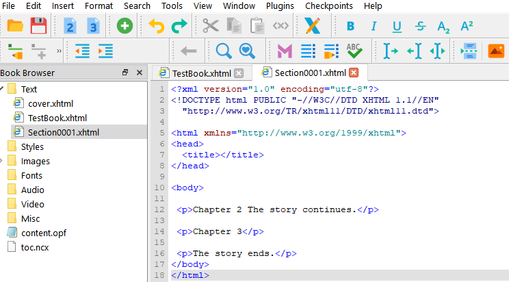 이제 HTML 파일이 EPUB 파일의 일부가 된다. 즉, 이제부터의 편집은 HTML 파일 자체가 아니라, EPUB 문서를 편집하게 되는 것이다. 아울러 Sigil에서 파일을 열면 "Book Browser" 윈도내에서 볼 수 있는 것처럼, EPUB 포맷에 필요한 여러가지 다른 파일들이 추가로 생성된다.