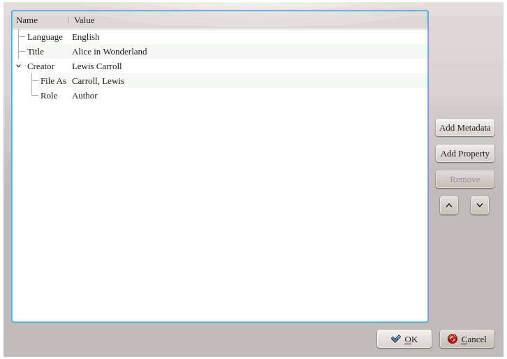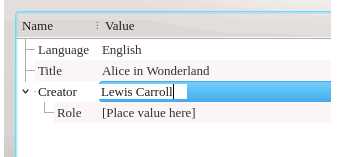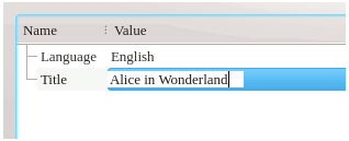 제목(Title) 행의 값(Value) 열을 더블클릭하면 해당 필드를 편집할 수 있다. 아래의 예에서는 책의 제목을 "Alice in Wonderland"로 입력하였다.