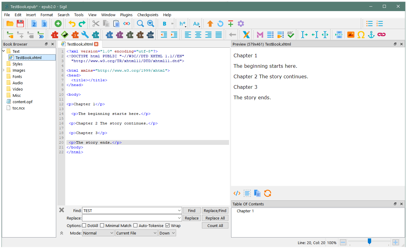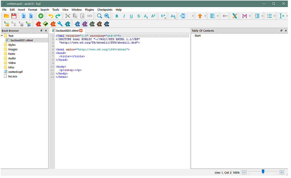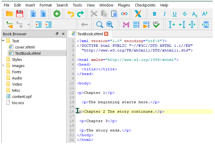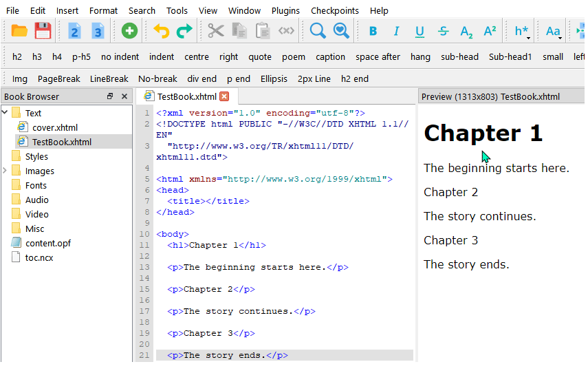 왼쪽 "Book Browser"윈도에는 EPUB에 포함된 모든 파일이 나타나고, 가운데에는 현재 선택된 파일의 코드를 수정할 수 있다.