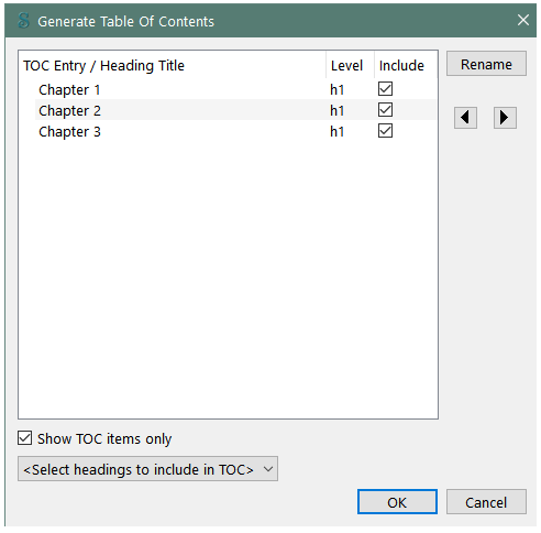 Sigil에서 목차를 생성하려면 이전 절에서 설명한 방식으로 입력된 장 이름이 식별되어 있어야 한다. 모든 장의 heading을 표시했다면, 목차 생성 아이콘 또는 Tools->Table of Contents->Generate Table of Contents를 선택한다. 그러면 아래와 같은 다이얼로그가 뜬다.