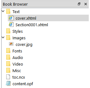 그 결과 "책 찾아보기(Book Browser)" 목차의 Text 폴더에 cover.xhtml 파일이 추가되며, Images 폴더에 cover.img 이미지가 추가된다.