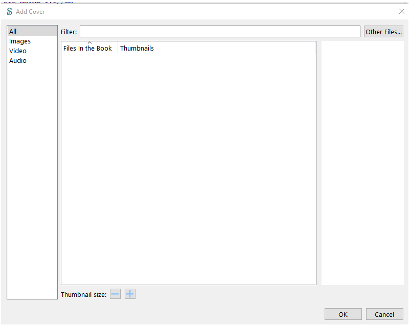 이 윈도에는 이미 추가되어 있는 이미지들이 나타나지만, 현재는 아무 이미지도 없어서 빈 화면만 나타난 것이다. 이 화면에서 "기타 파일(Other Files)" 버튼을 누르면, EPUB 파일에 이미지를 추가하면서 바로 표지로 지정할 수 있다.