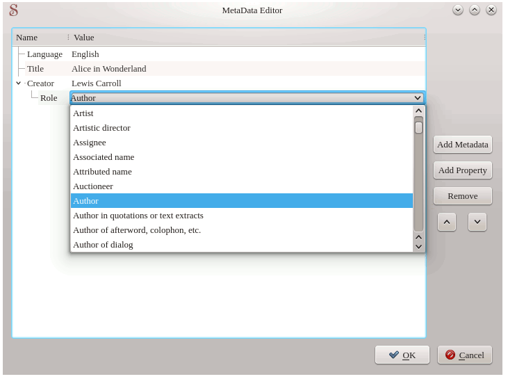 | 메터데이터에는 이외에도 아주 많은 항목이 있다. EPUB에는 제목, 저자, 언어만이 필수이지만, 더 많은 정보를 입력하고 싶다면 Add Metadata 혹은 Add Property 단추를 누르고 추가하면 된다. |