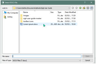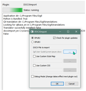 MS Word 파일에서 직접 EPUB 문서를 생성하려면, DiapDealer에서 개발한 DOCXImport 플로그인을 사용할 수 있다. 이 플러그인을 추가하면, 어떤 docx 문서를 html로 Sigil에 내보낼 수 있다. DOCXImport 플러그인 매뉴얼을 참고하라. (플러그인 설치는 Manage Plugin 장을 참고하라)
