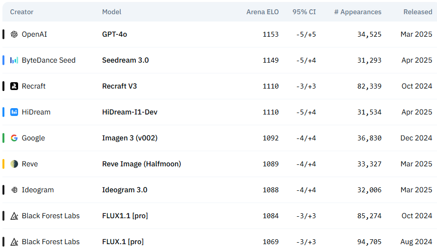 그런데... 발표된지 사흘인데... 아직까지 텍스트-이미지 리더보드에는 등장하지 않고 있습니다. 여전히 GPT-4o가 1등을 유지하고 있고요. 너무 성급하지 않나... 하는 생각도 드는데, 이건 좀 더 기다려봐야 할 듯 싶네요.