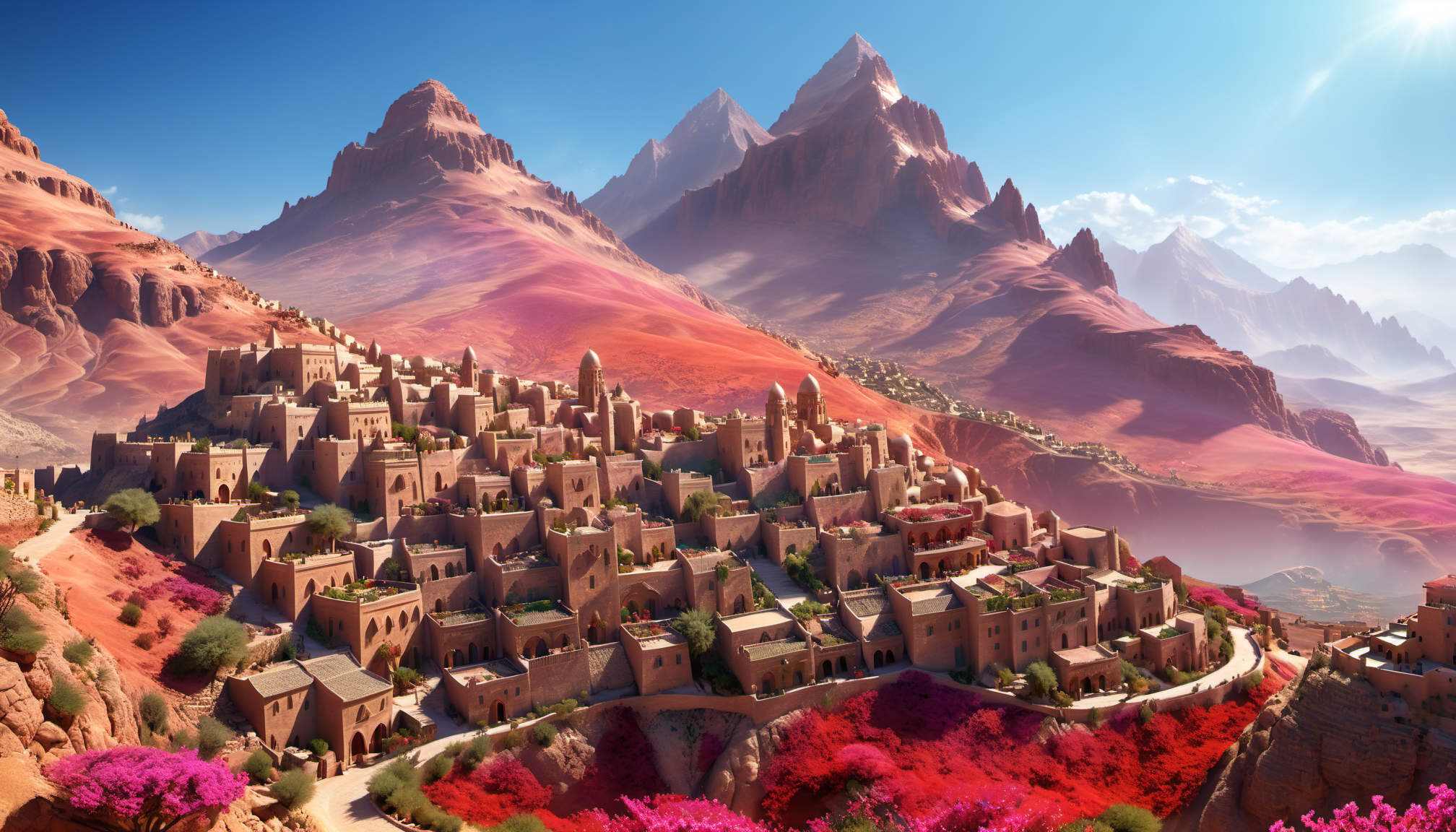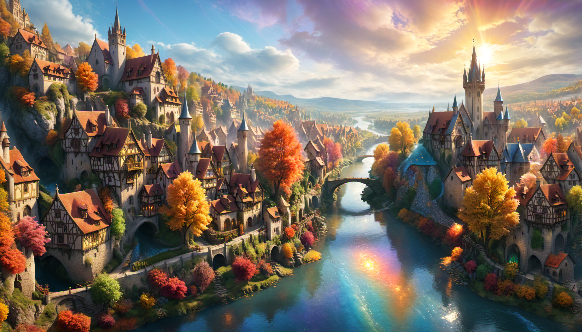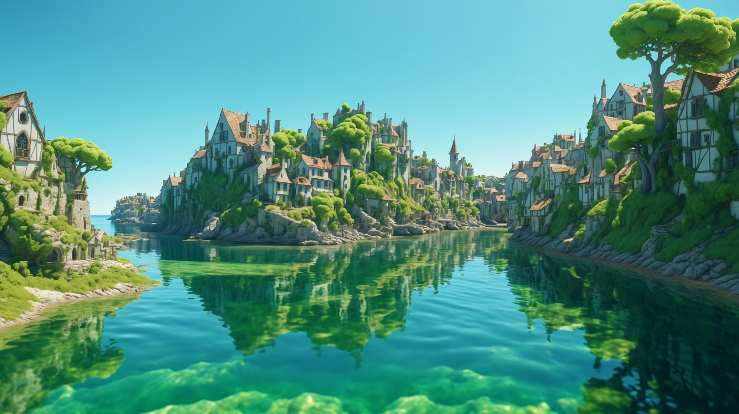 프롬프트: medieval island town in spring, 3D fractal landscape, close-up graphic design panels, UHD, 8K, depth of field, refraction, red color tint