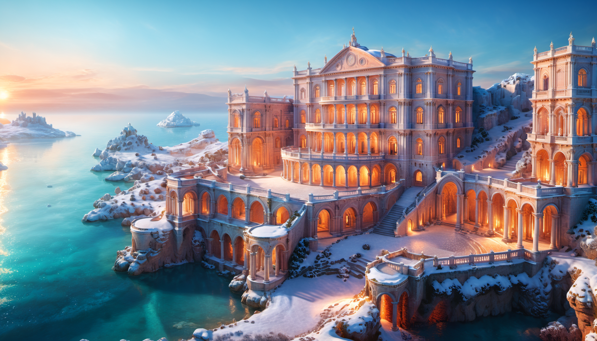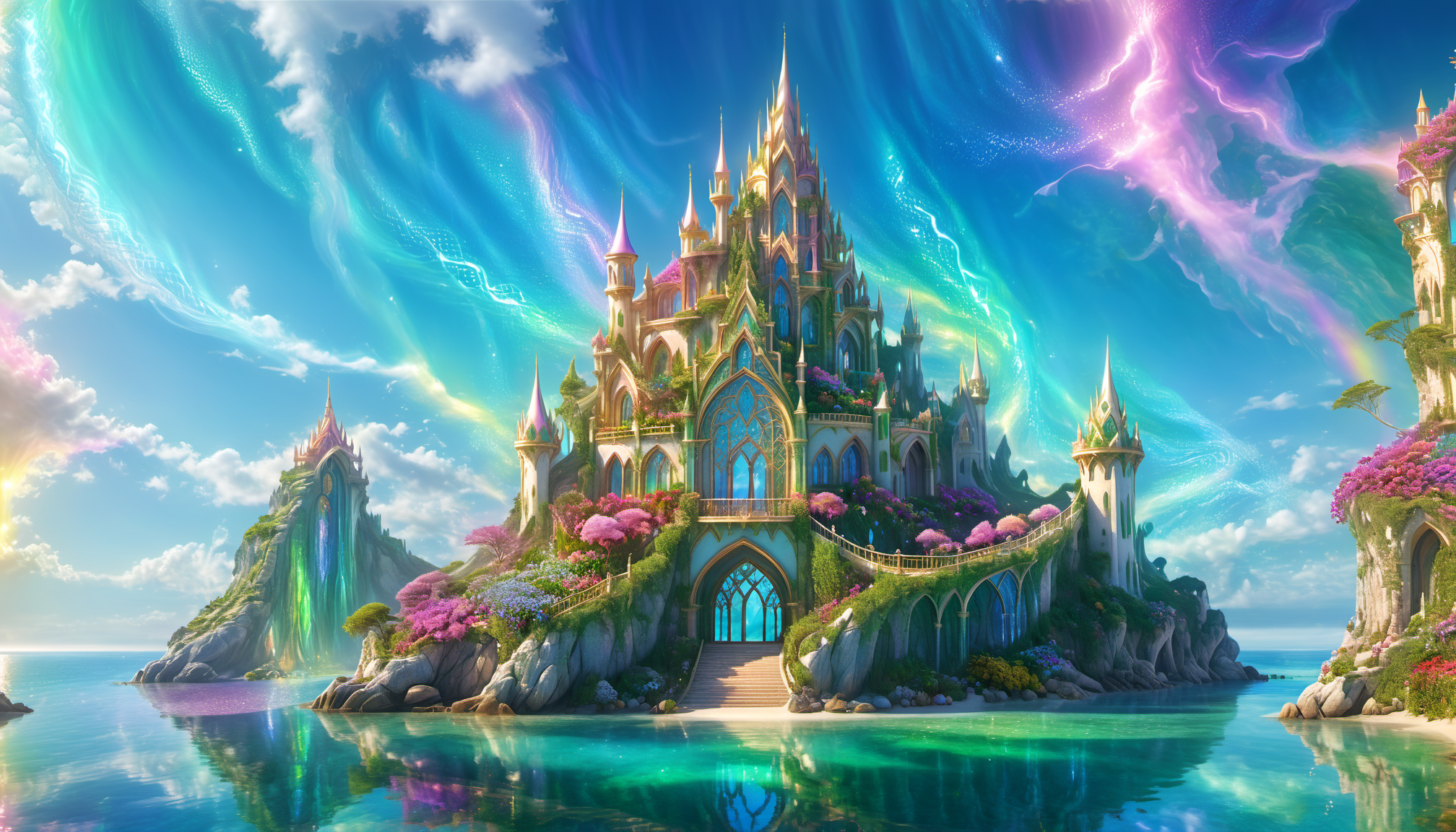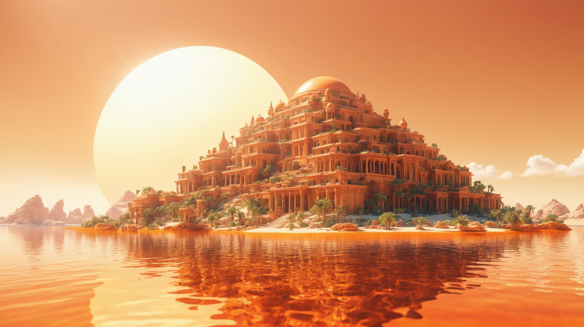 프롬프트: medieval island town in spring, 3D fractal landscape, close-up graphic design panels, UHD, 8K, depth of field, refraction, red color tint