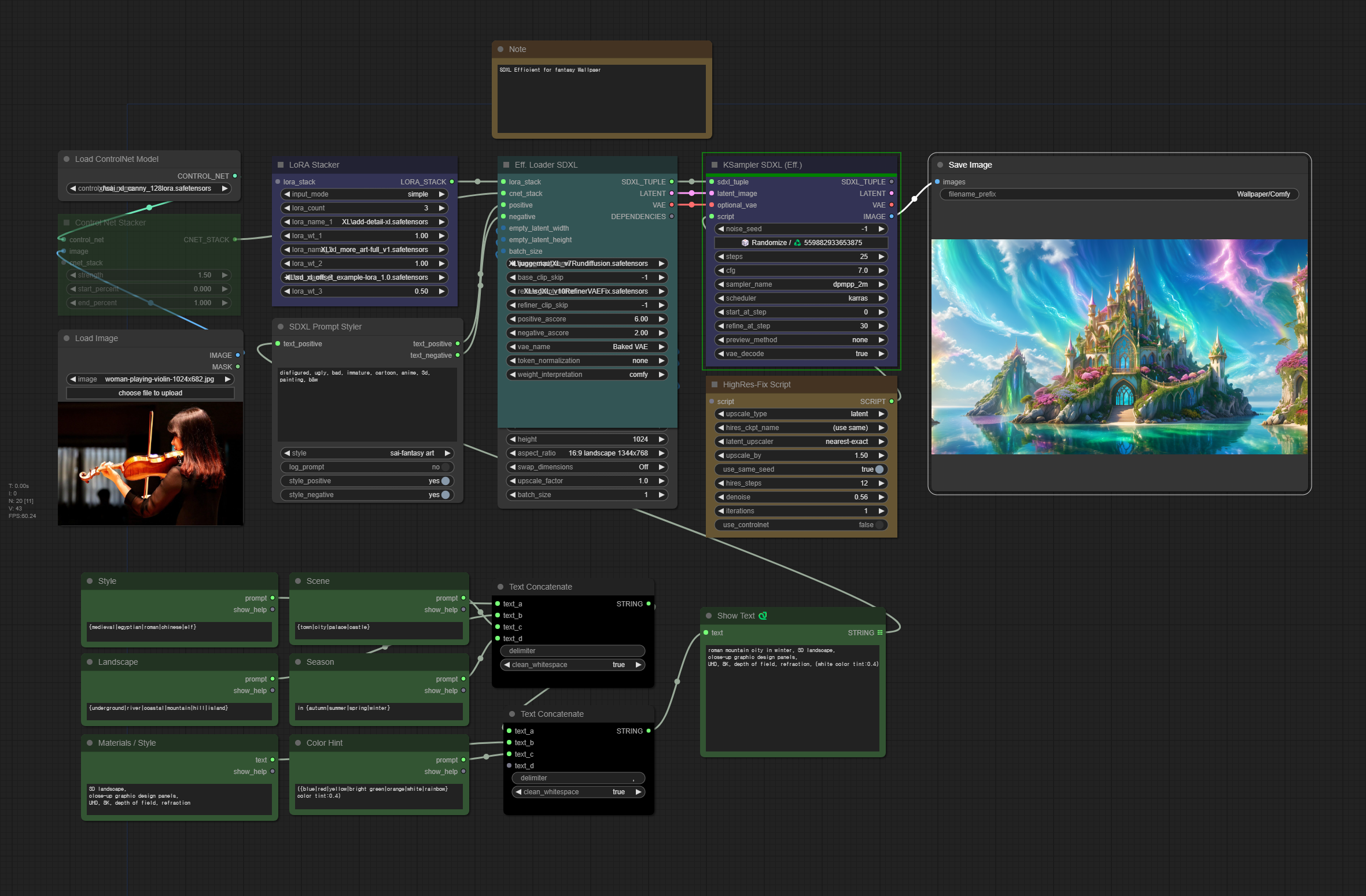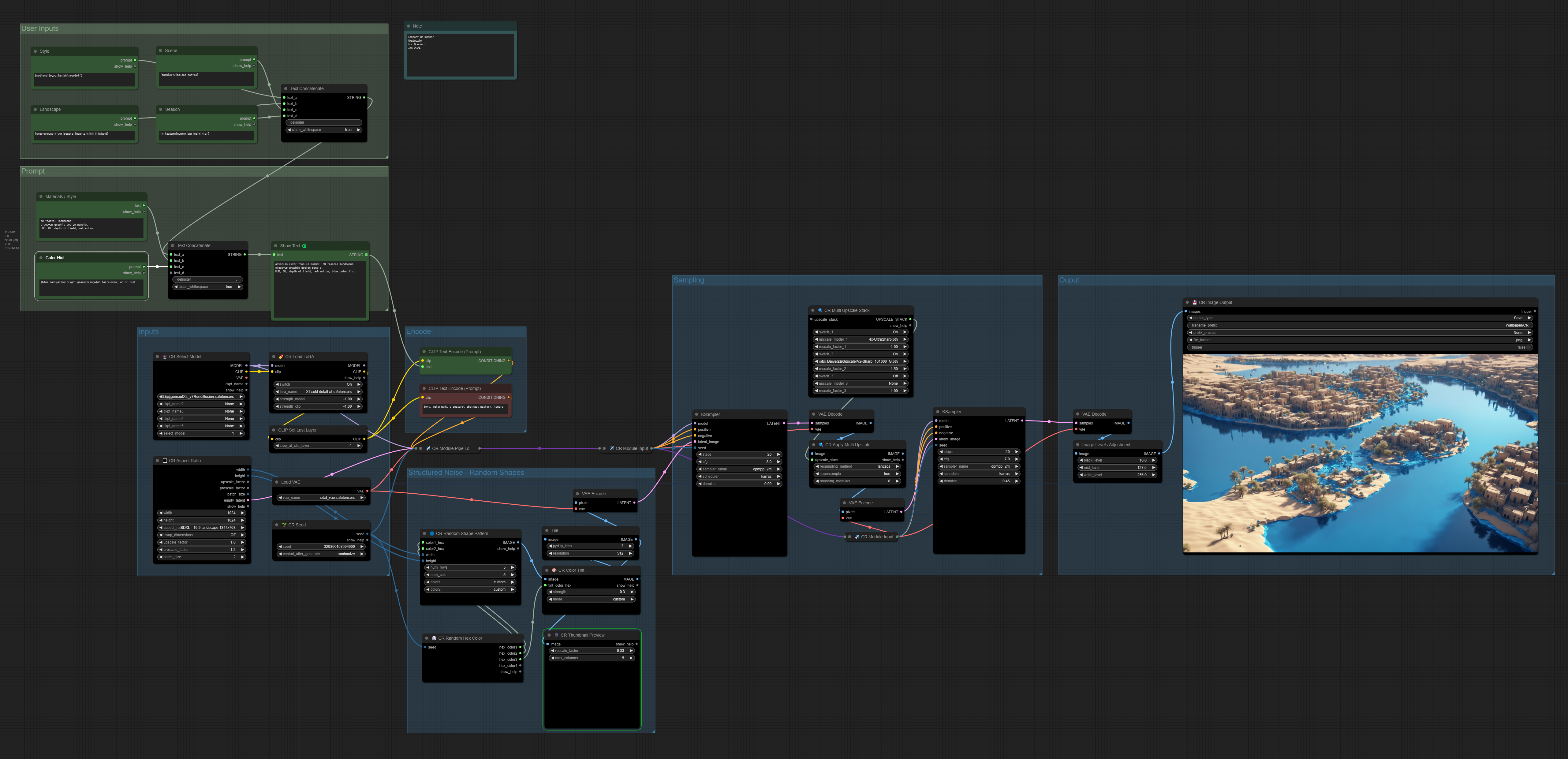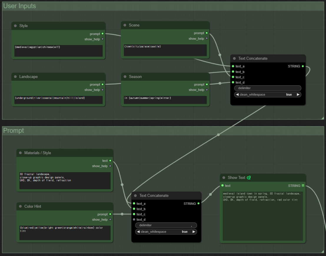 먼저 좌측 위는 프롬프트를 조합하는 부분입니다. 위쪽에서는 스타일(중세/이집트/중국), 장소(마을/도시/궁전/성), 풍경(지하/강/해변/산/언덕/섬), 계절(봄/여름/가을/겨울)이 나열되어 있습니다. 매번 이미지가 생성될 때마다 무작위로 선택되어 조합됩니다. 이것만 해도 3x4x7x4=336가지나 됩니다. 그 아래에는 색(blue/red/yellow/bright green/orange/white/rainbow)등이 무작위로 선택되고 기본 스타일(3D fractal landscape, close-up graphic design panels, UHD, 8K, depth of field, refraction)이 있습니다. 최종적으로 선택된 사항은 맨 아래에 [Show Text] 노드에 나타나게 됩니다. 현재는 아래와 같습니다.