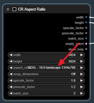 그다음 [CR Aspect Ratio] 노드에 들어가서 동일한 종횡비의 이미지 크기를 선택합니다. SDXL에서 16:9 비율은 1344x768 크기가 최적임을 알 수 있습니다.