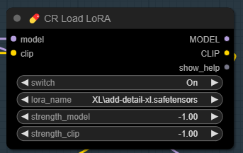 [CR Load LoRA] 노드에서는 LoRA 파일을 선택합니다. 저는 섬세한 디테일을 추가해주는데 사용하는 add-detail-xl 을 사용했습니다. 없으시면 다운로드 받은 후 ComfyUI\models\lora 폴더에 넣어주시면 됩니다. AUTOMATIC1111과 모델을 공유하실 경우엔 여기를 보세요) 다 받은 후에는 화면을 새로고침(F5)하면 목록에 나타납니다.