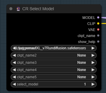 먼저 체크포인트 모델을 선택해야 합니다. [CR Select Model] 노드에서 적당한 SDXL 기반의 모델을 선택해 주시면 됩니다. 저는 JuggernautXL 모델을 사용했습니다. 없으시면 다운로드 받은 후 ComfyUI\models\checkpoints 폴더에 넣어주시면 됩니다. AUTOMATIC1111과 모델을 공유하실 경우엔 여기를 보세요) 다 받은 후에는 화면을 새로고침(F5)하면 목록에 나타납니다.