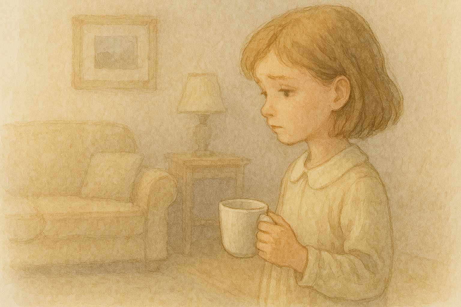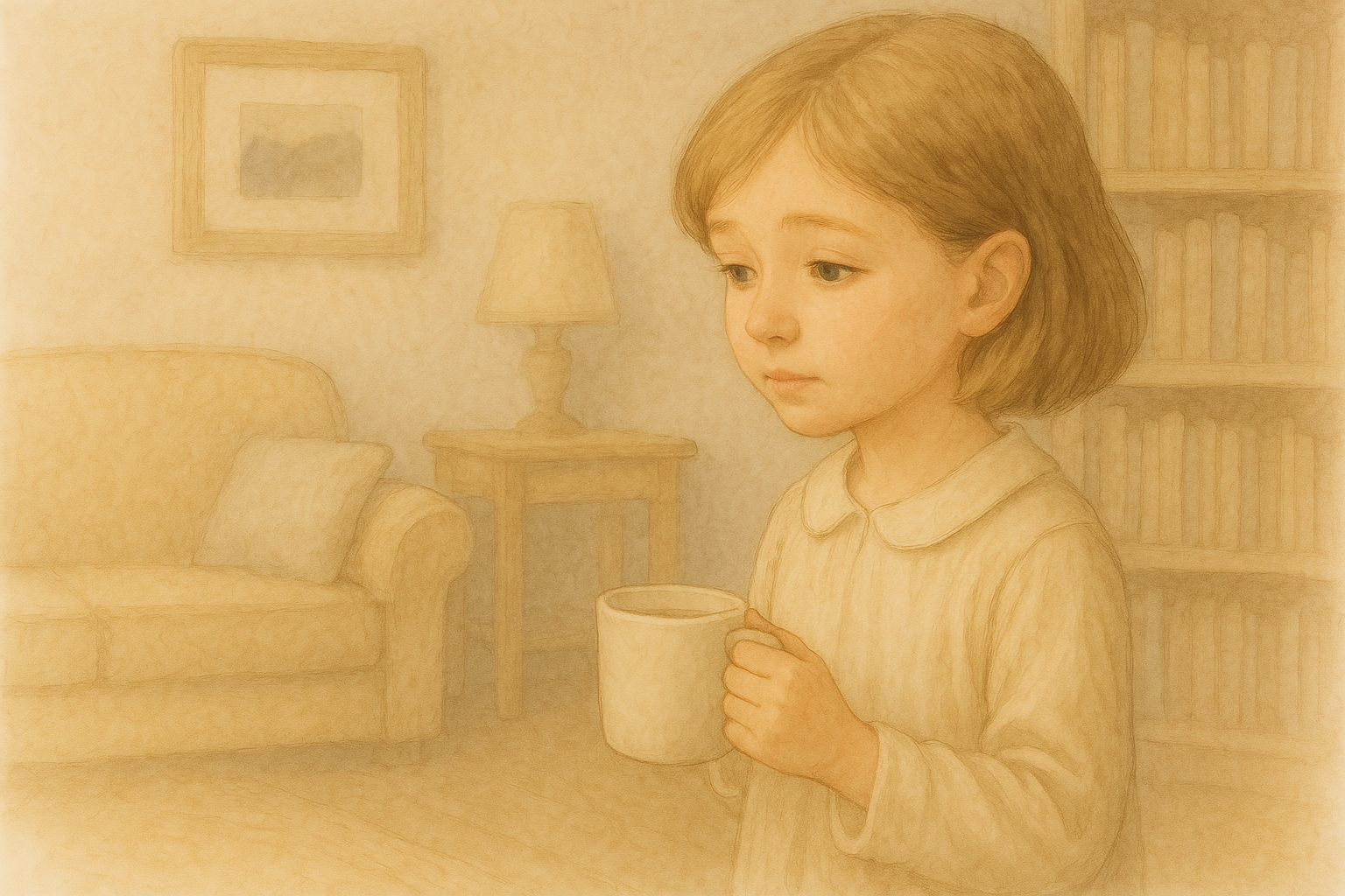 4번 씬: 작은 소녀가 집안에서 창밖을 내다보며 찻잔을 들고 밖을 바라보고 있다.