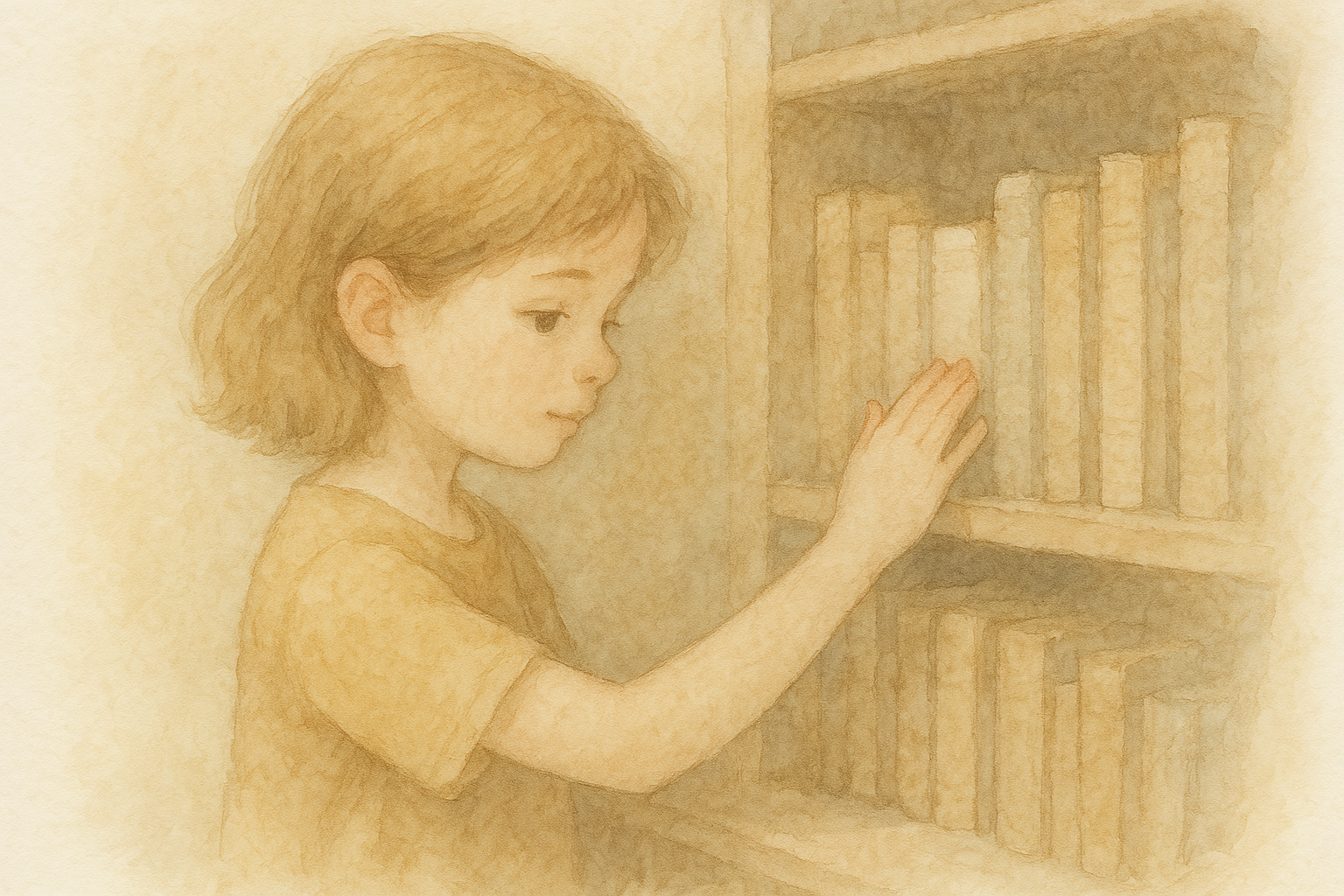 3-1번 씬: 작은 소녀가 먼지 쌓인 책장을 쓰다듬는다.