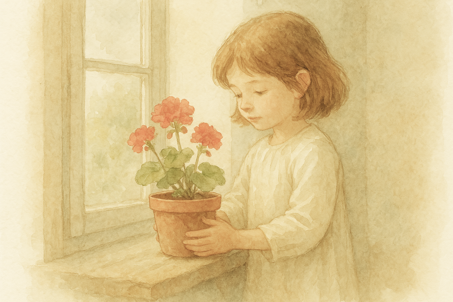 | (뒤 뜰의 꽃을/옮겨 담았어요/제라늄 꽃/을/) 2-2(4)번 씬: 소녀가 제라늄꽃 화분을 창가에 올린다. |