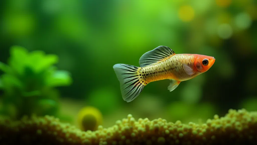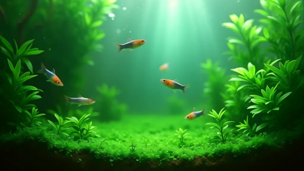 프롬프트: A tranquil aquarium filled with lush green aquatic plants, where vibrant guppies swim gracefully. Soft light filters through the water, casting a peaceful glow, enhancing the serene and harmonious underwater atmosphere.