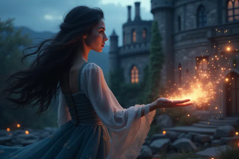 프롬프트: A mesmerizing scene featuring a beautiful witch with flowing hair and an elegant, mystical appearance. She is casting a glowing, ethereal spell, with magical sparks and trails lighting up the surroundings. The backdrop showcases a grand, ancient castle under a twilight sky, with ivy climbing its weathered walls and soft lights glowing from its windows. The scene feels enchanting and otherworldly, with subtle, dynamic animations in the spell and environment, such as a gentle breeze moving her hair and glowing embers floating in the air, camera zooming in her face