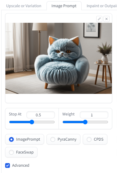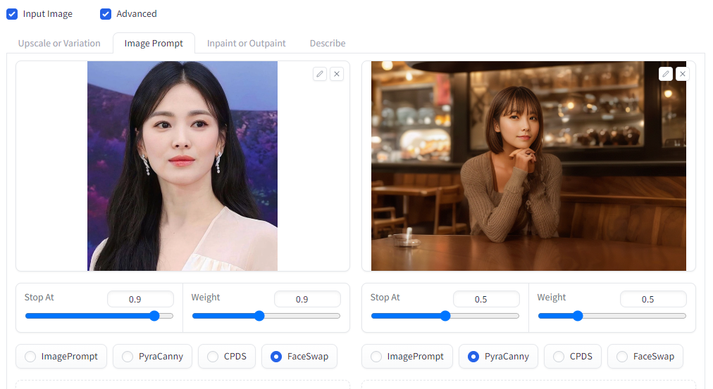 이미지 프롬프트에는 ImagePrompt, PyraCanny, CPDS, FaceSwap 등 네가지 옵션이 있습니다.