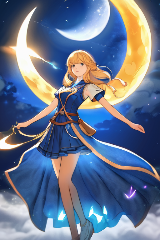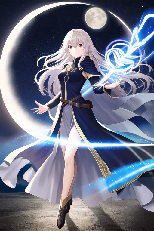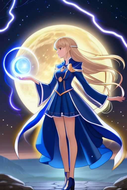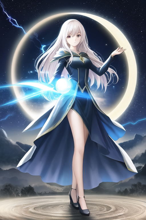 프롬프트: a 25 year old mage, dress, full body, magic, lightning, rim light, moon, night