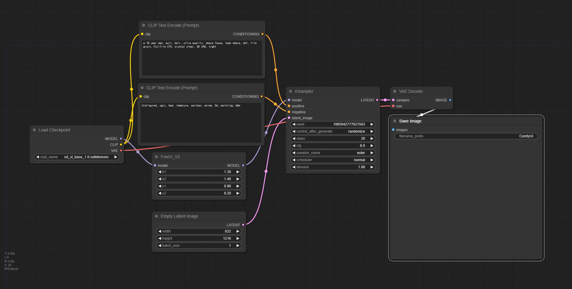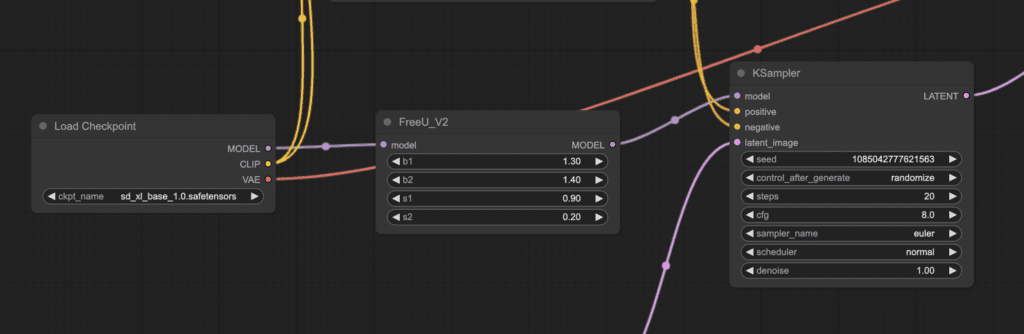 ComfyUI에서 FreeU를 사용하는 방법은 간단합니다. 아래와 같이 [Load Checkpoint] 노드와 [KSampler] 노드 사이에 [FreeU_v2] 커스톰 노드를 끼워 넣으면 됩니다.