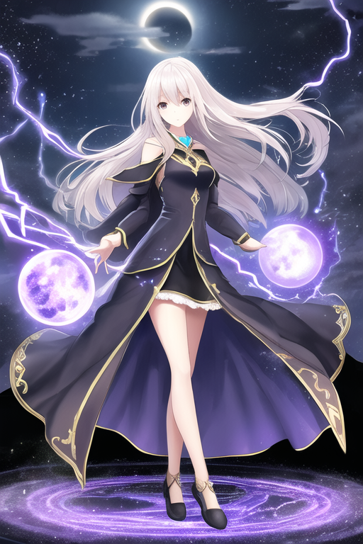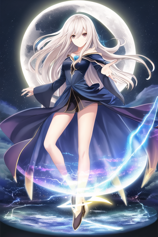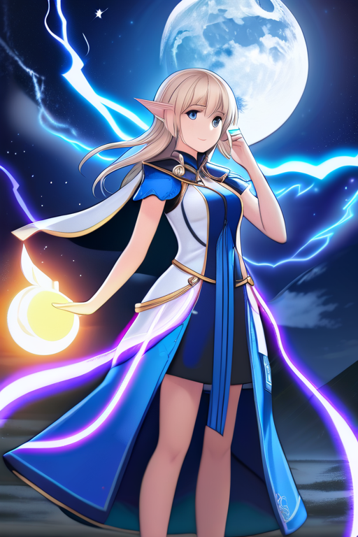 프롬프트: a 25 year old mage, dress, full body, magic, lightning, rim light, moon, night