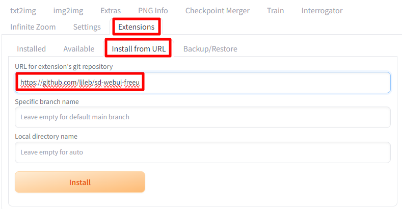 Automatic1111에서는 FreeU extension을 설치하여야만 사용할 수 있습니다. 설치하는 방법은 다음과 같습니다.