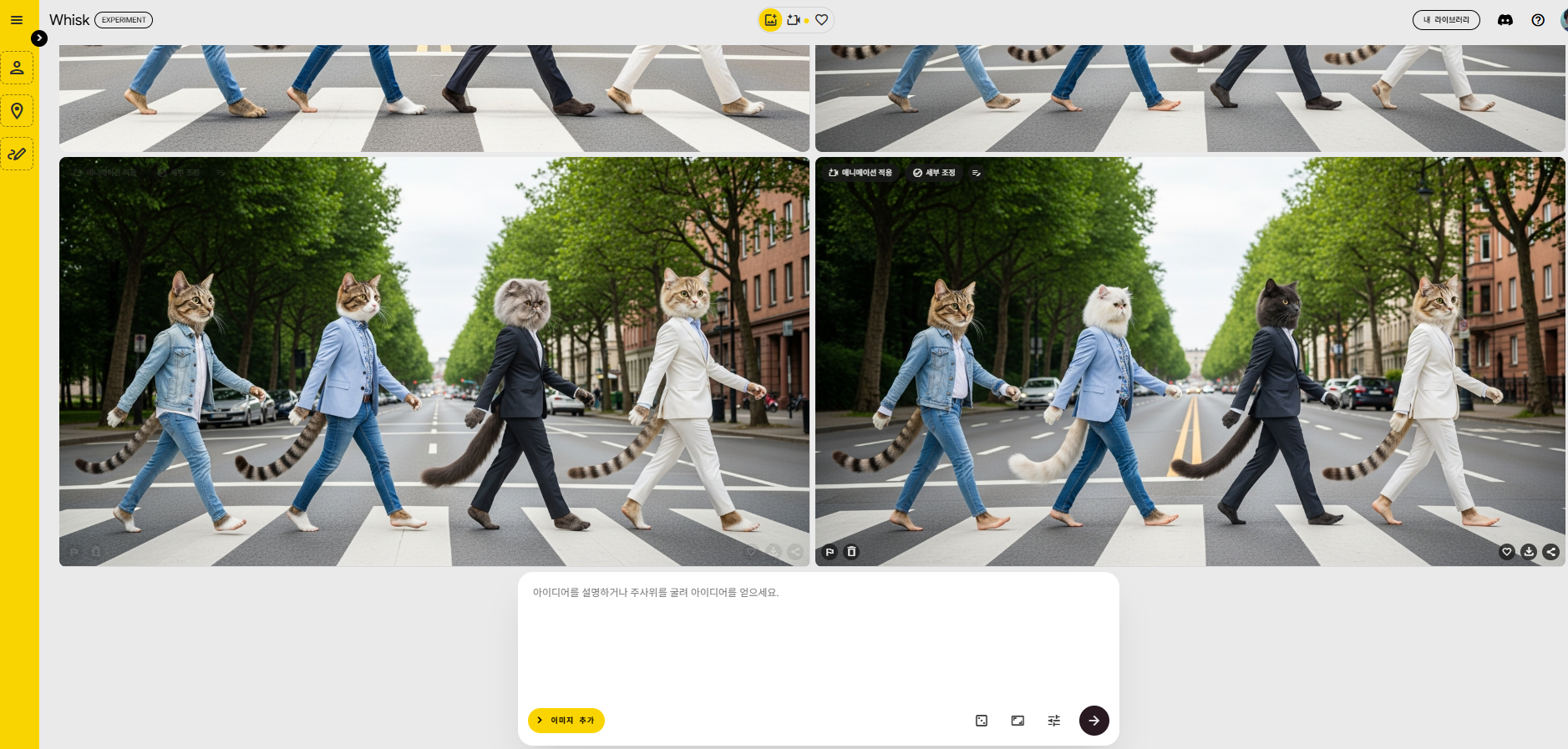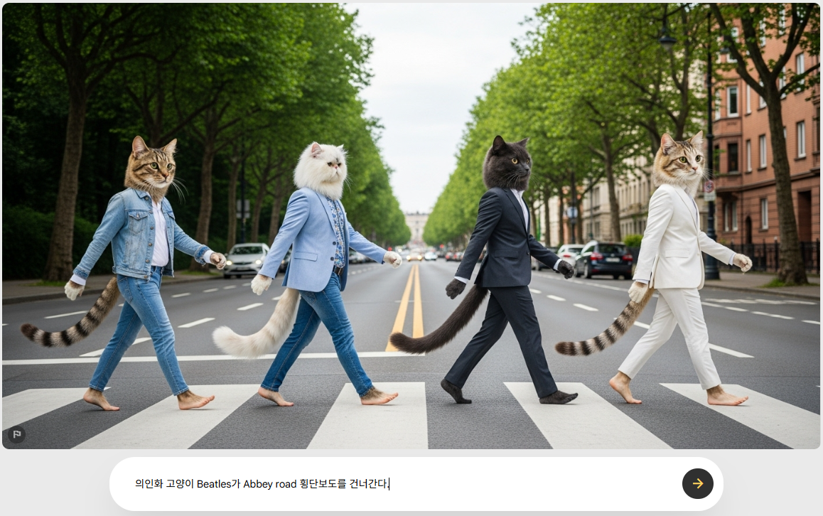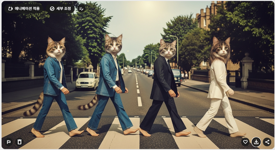 맨 먼저 "의인화 고양이 Beatles가 Abbey road 횡단보도를 건너간다."라고 프롬프트를 주고 생성한 결과입니다. 두 장이 생성되는데, 그럴 듯한 것을 선택했습니다.