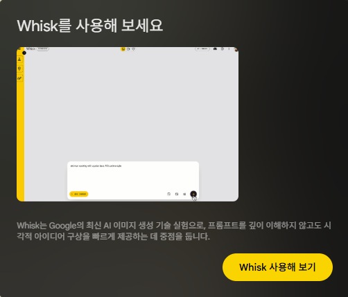 고양이 비틀즈가 Abbey Road를 건너가는 모습을 생성하려고, 여느 때처럼 구글 Image FX에 접속하자, 아래와 같이 새로운 실험 서비스인 Whisk를 사용해 보라는 알림이 떴습니다. 물론 바로 접속해서 생성을 시도했습니다.