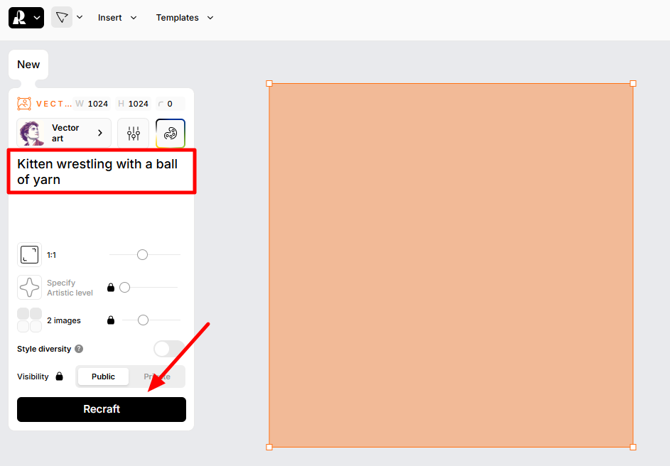 이제 텍스트 프롬프트를 입력합니다. 저는 "털실 뭉치와 씨름하는 새끼 고양이"를 DeepL로 번역하여 작성하였습니다. 프롬프트입력이 끝나면 맨 아래 "Recraft"버튼을 누릅니다.