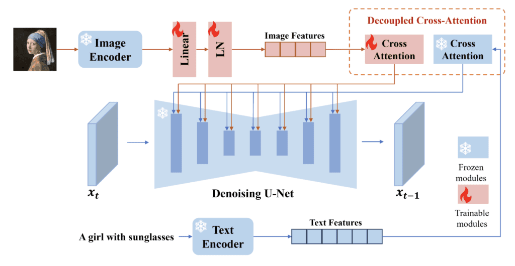 원래의 IP-adapter는 CLIP 이미지 인코더를 사용하여 참조 이미지로부터 특징들을 추출합니다. 이때, IP adapter는 이미지에 대해 별도의 교차 인지 레이어를 학습시킨다는 점이 뛰어난 점입니다. 이를 통해 이미지 생성 처리과정을 좀 더 효율적으로 제어할 수 있습니다.