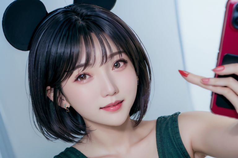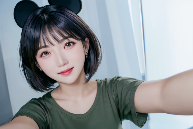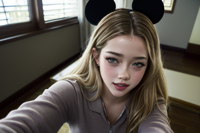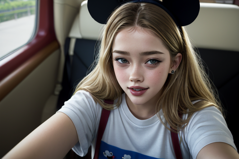 프롬프트: Selfie photo of a woman, smiling, disney, mickey headwear
