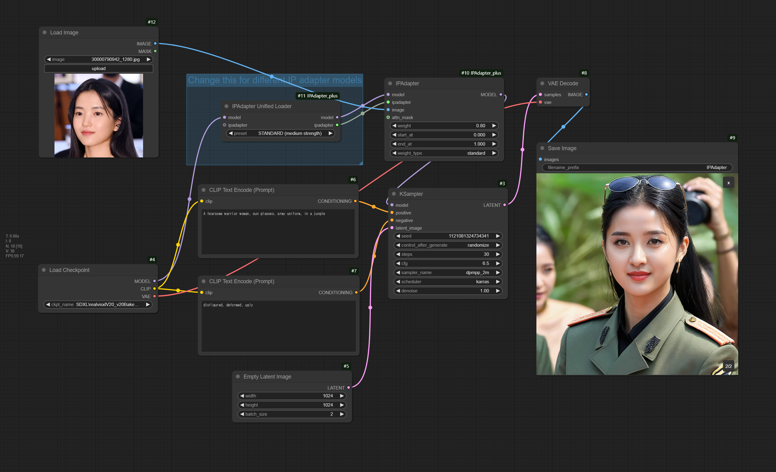 아래는 IP-Adapter Face ID SDXL 용 워크플로입니다. 사용하기 전에 위에 있는 표에 따라 적절한 IP-Adapter 모델과 CLIP Vision 모델을 선택해주면 됩니다.