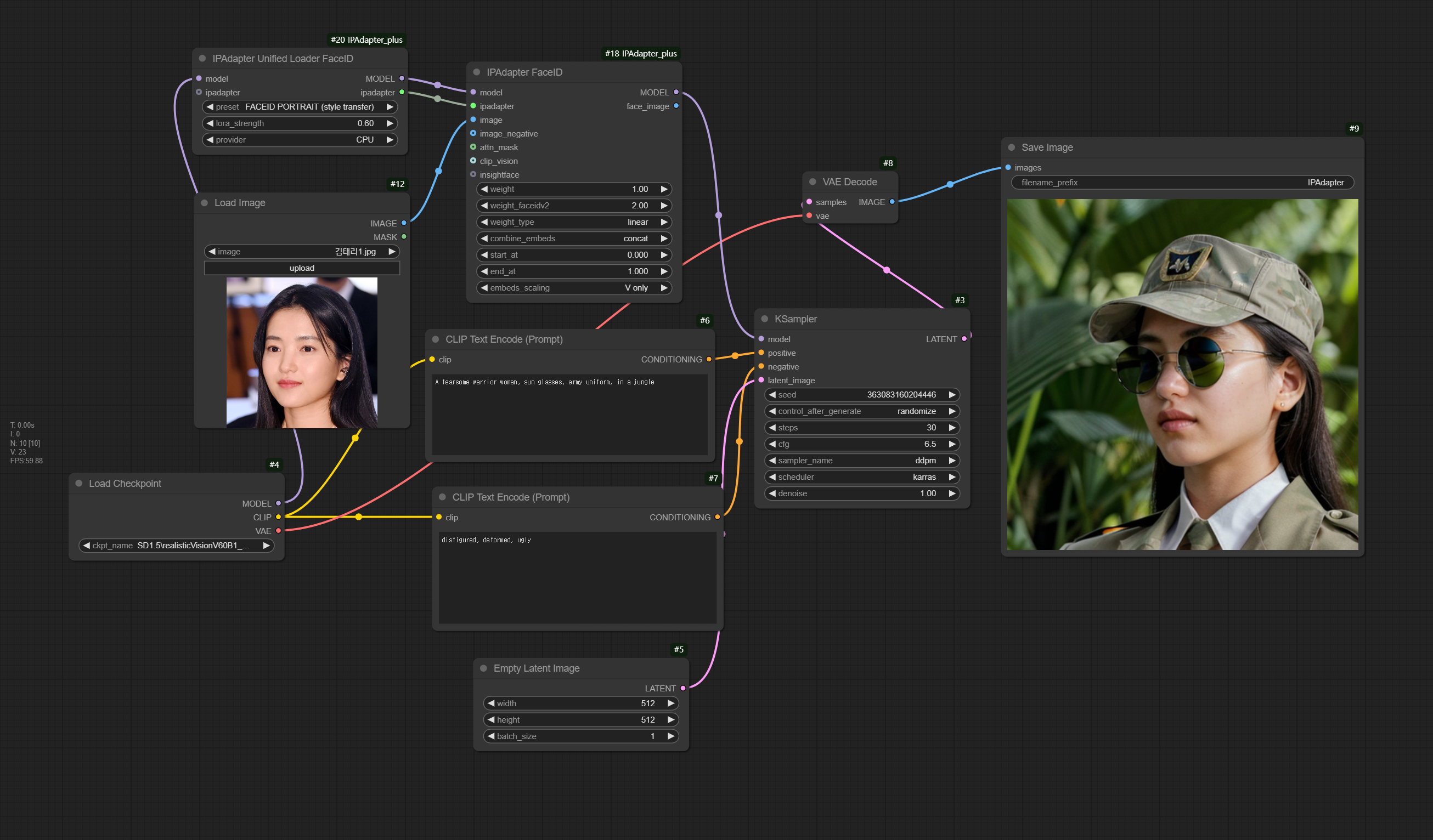 아래는 IP-Adapter Face ID SD 1.5 용 워크플로입니다. 사용하기 전에 위에 있는 표에 따라 적절한 IP-Adapter 모델과 CLIP Vision 모델을 선택해주면 됩니다. FaceID를 사용하니 김태리님의 얼굴이 살아나네요.