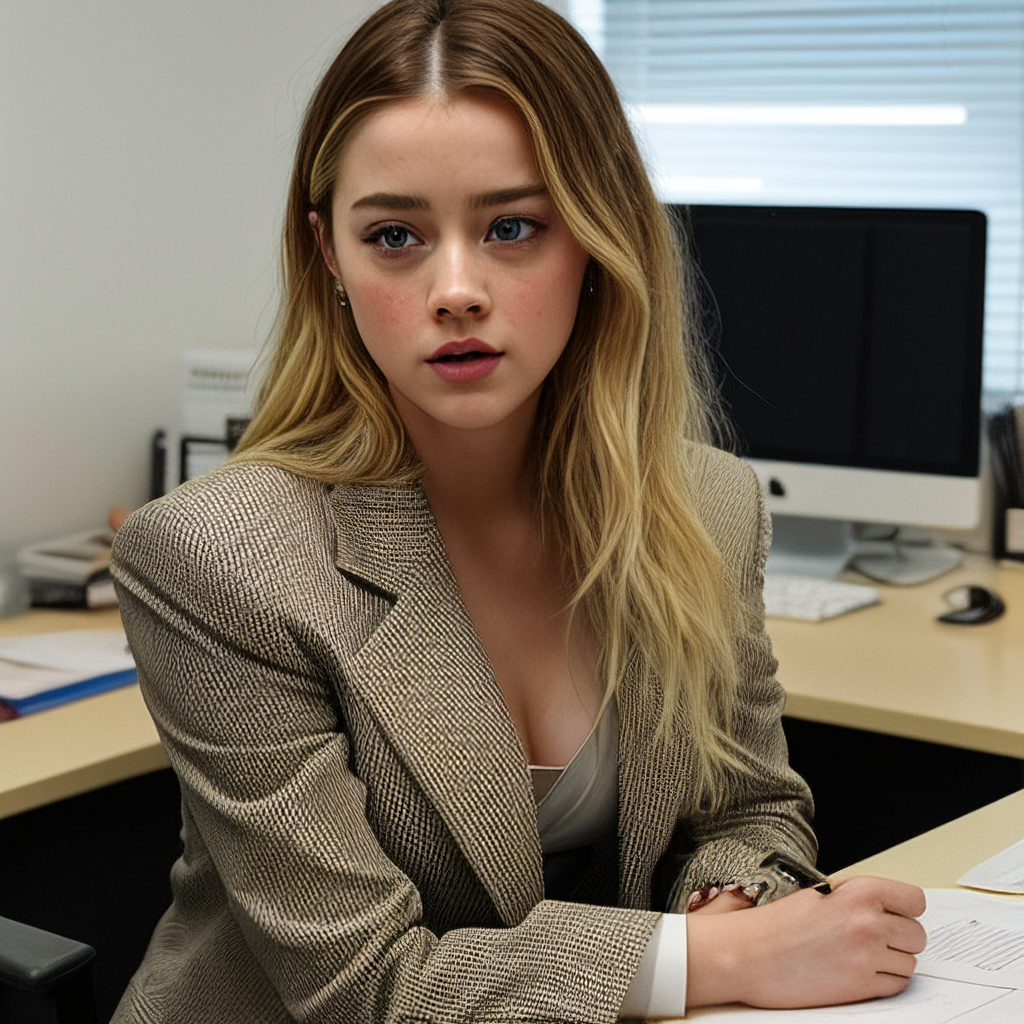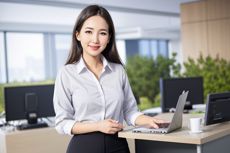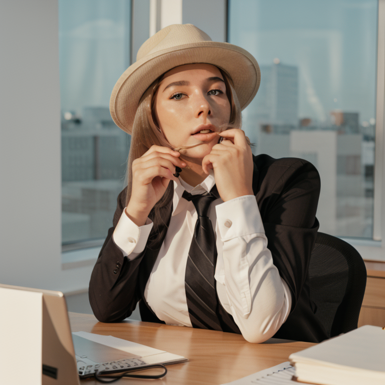 프롬프트: A woman in office, white professional shirt
