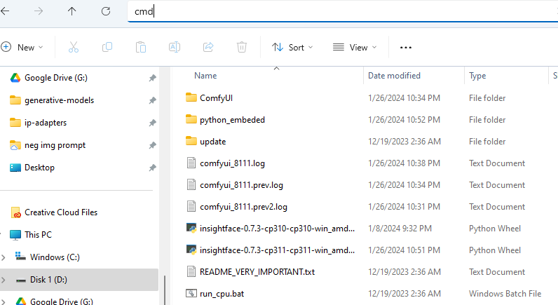 그전에 최근 ComfyUI가 Python 버전을 업데이트했는데, 그 버전부터 확인해야 합니다. 파일 탐색기를 열어 ComfyUI_windows_potable 폴더로 들어간 후, 주소에 cmd를 입력하고 Enter 키를 누릅니다.