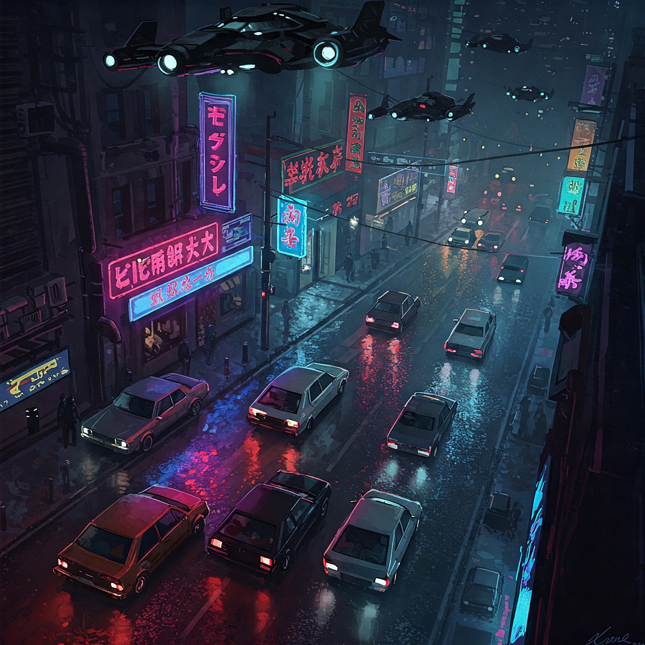 예: "늦은 밤 네온사인이 밝히고 있는 어두운 거리에 자동차가 지나고 그 위로 비행정이 날라다니고 있다. 이러한 모습을 위에서 아래로 내려보는 각도로, 인상주의 스타일과 사이버 펑크 스타일을 조합해서 이미지로 생성해줘"