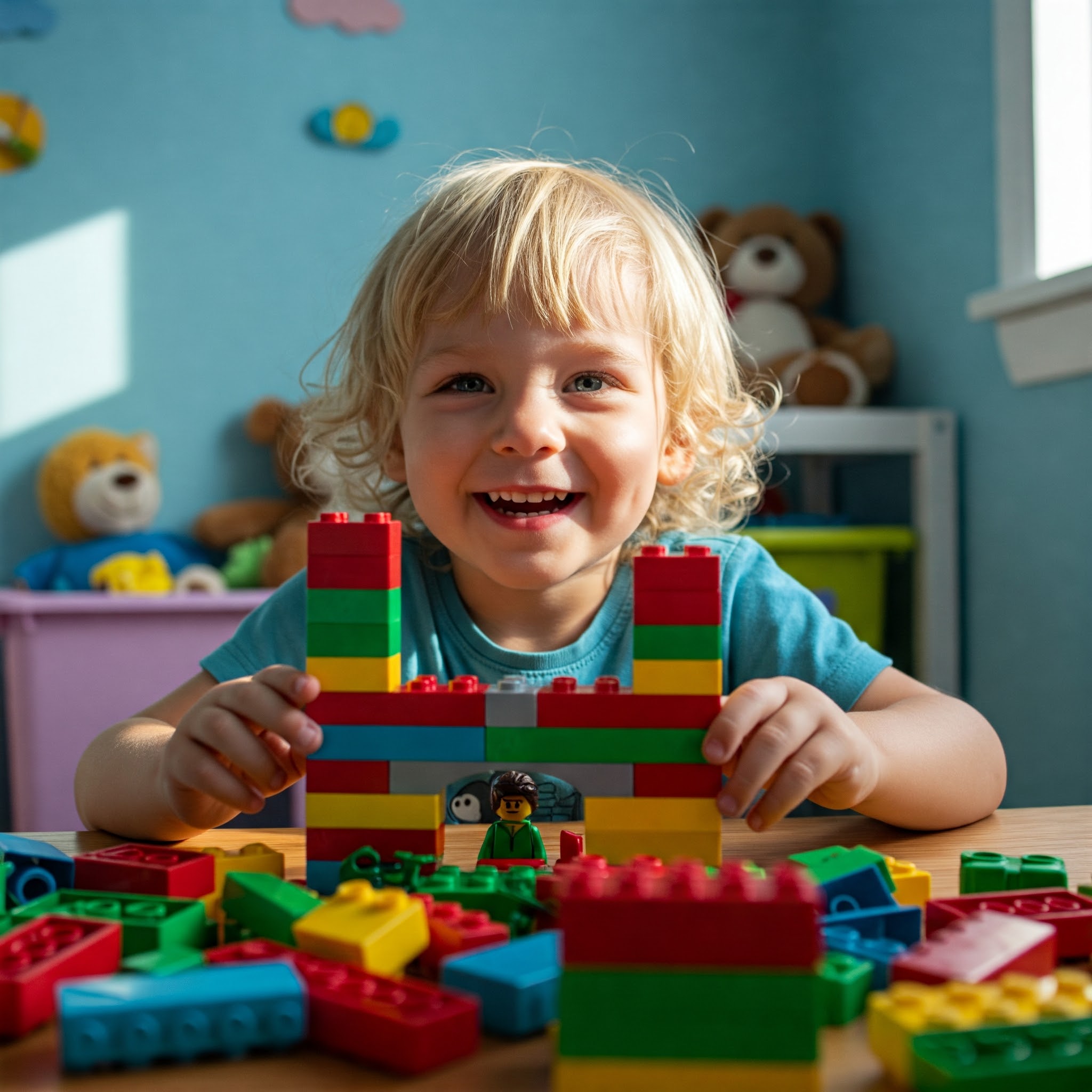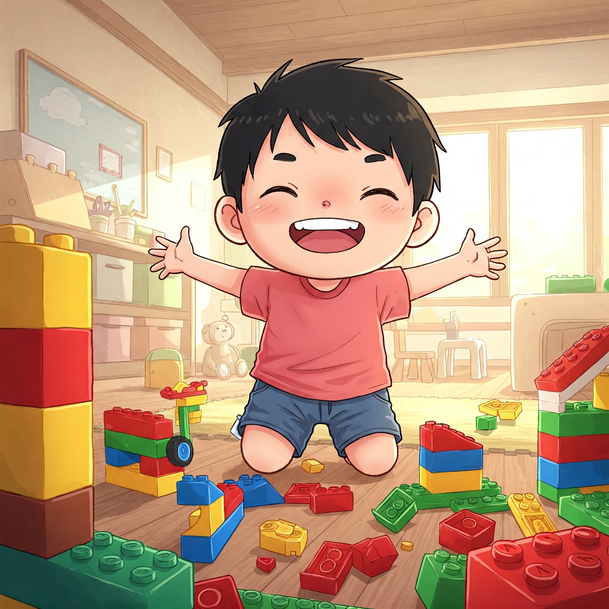 - 특별히 프롬프트를 위한 형식같은 것은 고민하지 마시고, 그냥 평상시 말투로 이미지에 들어갈 내용을 입력한 후, 맨 끝에 "이미지를 생성해줘", "그림을 그려줘"와 같이 마무리합니다. 예를 들어, "아이들 놀이방에서 레고를 가지고 노는 귀여운 아이를 그려줘"라고만 입력하면 아래와 같은 이미지가 생성됩니다. 이때 원하는 내용을 자세하게 기술할 수록 자신이 원하는 이미지가 생성될 확률이 높습니다.
