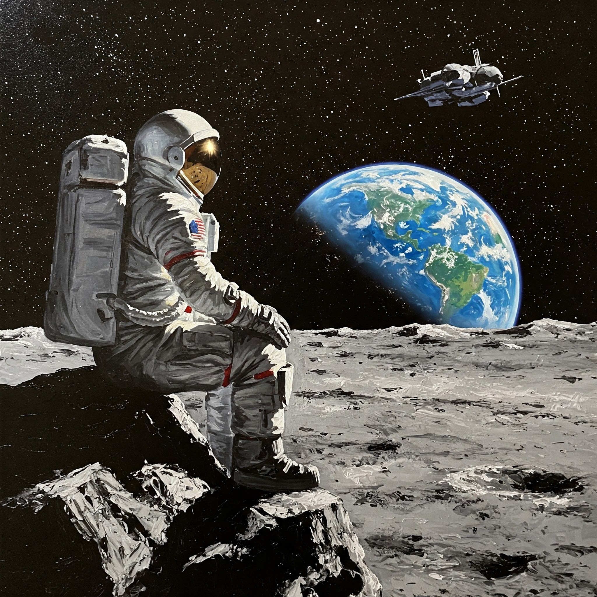 예를 들어, "달에 있는 바위위에 우주인이 앉아 있다. 배경으로 멀리 우주선이 보이고 수평선으로 지구가 떠오르고 있다. 이 내용을 콘트라스트가 강한 사실적인 유화 스타일 이미지로 생성해줘"와 같이 프롬프트를 입력해줍니다.