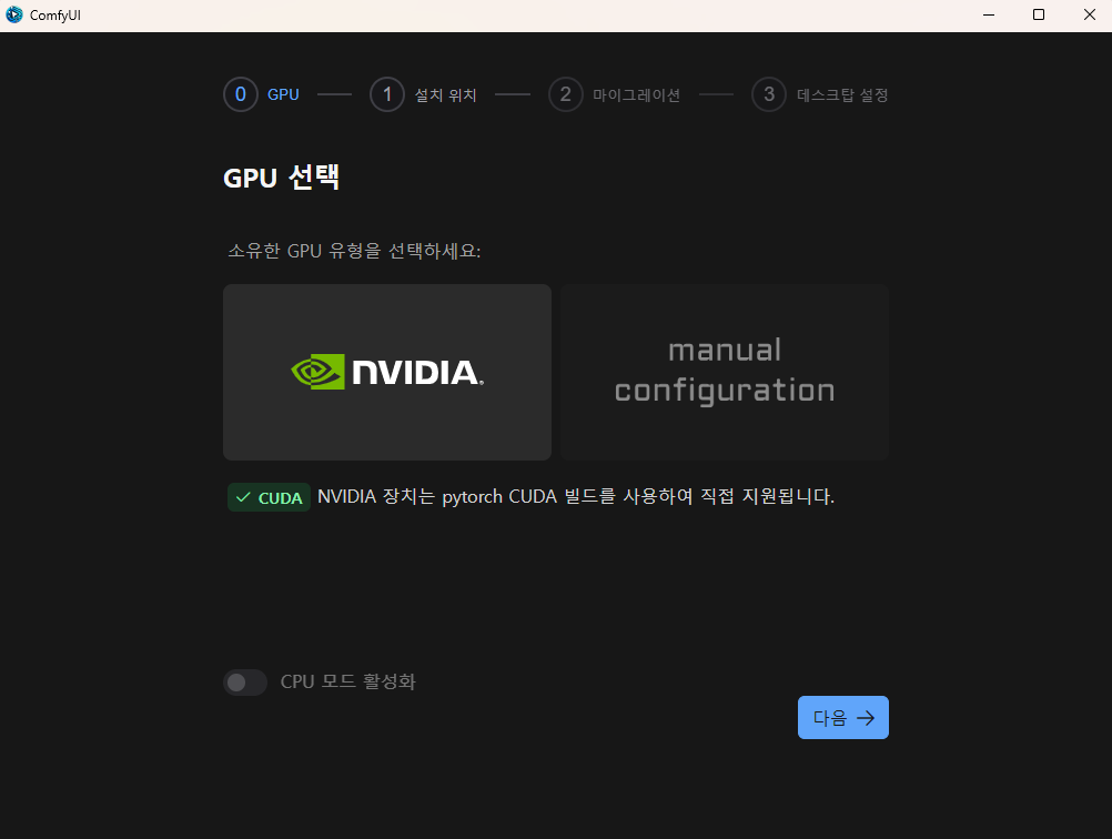 다음으로 GPU를 선택하는 화면이 나옵니다. 직접 구성(maunal configuration)하는 방법도 있고, 아랫쪽에는 GPU없이 CPU만으로 돌리는 방법도 있습니다. 다음 버튼을 누릅니다.