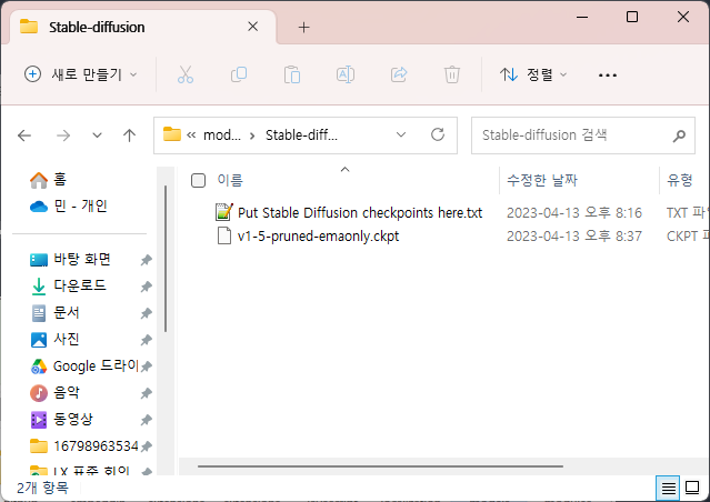 이제 파일 탐색기를 열고 스테이블 디퓨전에 사용하는 모델이 들어가는 폴더로 이동합니다. "%userprofile%\stable-diffusion-webui\models\Stable-diffusion" 입니다. 아래와 같이 "Put Stable Diffusion checkpoints here.txt 파일이 보이면 됩니다. 여기에 Stable Diffusion 1.5 모델 checkpoint 파일 (여기를 누르세요)을 다운 받아 넣어줍니다.