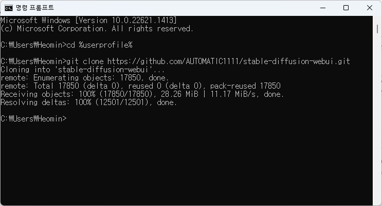 해당 github 에 있는 코드를 "%userprofile%\stable-diffution-webui"로 클론된 겁니다. (클론은 대략 복사와 비슷하다고 생각하시면 됩니다.) "dir" 명령을 실행시키면 stable-diffution-webui 이라는 서브 디렉토리가 만들어져 있을 겁니다.