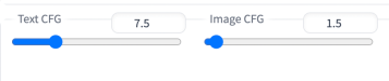 이 두가지 CFG 슬라이더의 의미는 일반 Stable Diffusion과 동일합니다. 즉, CFG 값이 낮으면 프롬프트나 이미지는 거의 무시되고, CFG 값이 높으면 프롬프트나 이미지를 더 많이 따라가게 됩니다. 참고로 여기에서 text CFG와 image CFG를 높이는 것은 정반대의 효과를 가져오게 됩니다. 즉, 텍스트 CFG 값을 올리면 이미지가 더 많이 변경되고, 이미지 CFG 를 높이면 이미지의 변경이 적어집니다. 원하는 효과를 얻으려면 이 두 값을 적절하게 조정해야 합니다.
