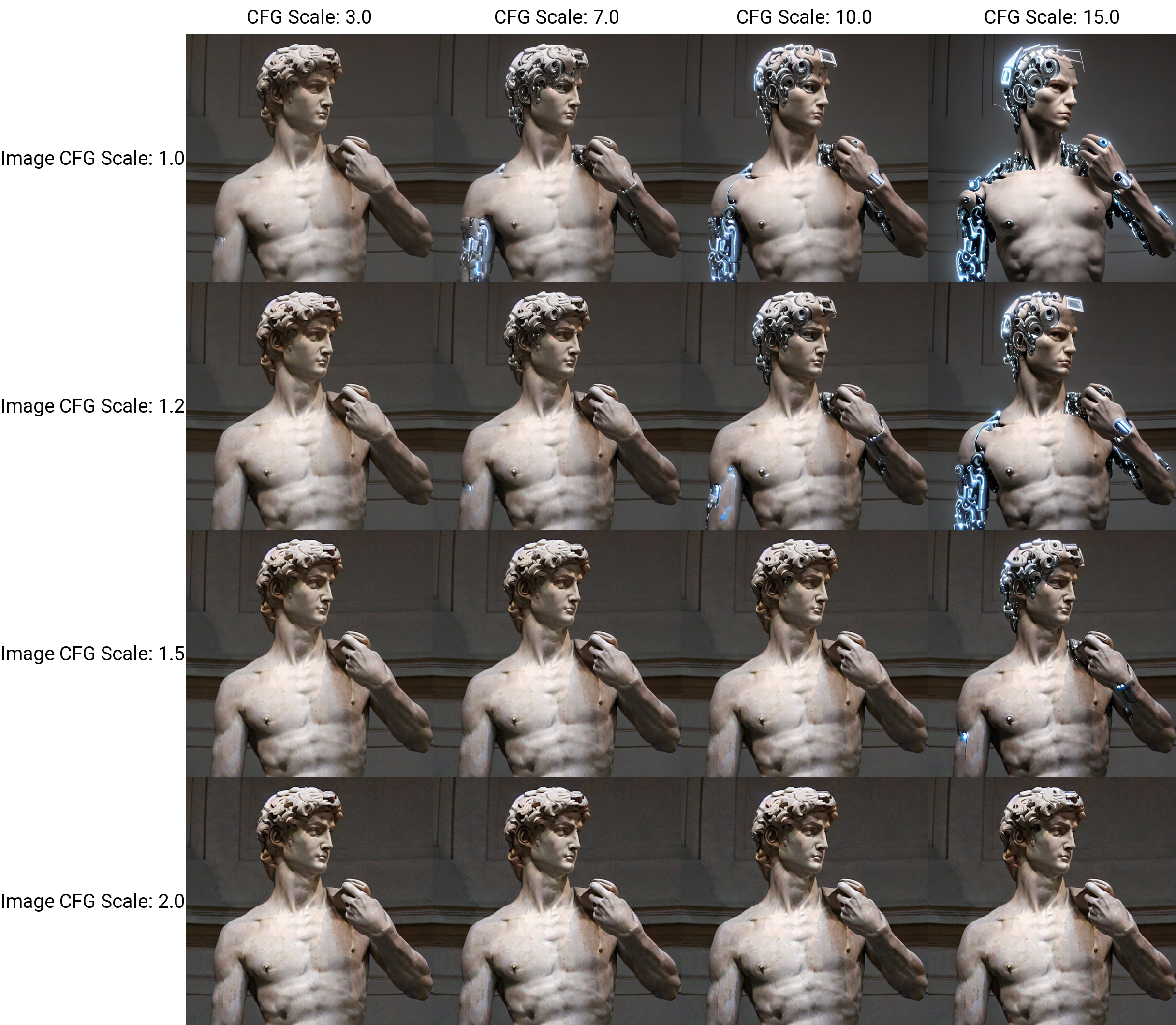 이 두가지 CFG 슬라이더의 의미는 일반 Stable Diffusion과 동일합니다. 즉, CFG 값이 낮으면 프롬프트나 이미지는 거의 무시되고, CFG 값이 높으면 프롬프트나 이미지를 더 많이 따라가게 됩니다. 참고로 여기에서 text CFG와 image CFG를 높이는 것은 정반대의 효과를 가져오게 됩니다. 즉, 텍스트 CFG 값을 올리면 이미지가 더 많이 변경되고, 이미지 CFG 를 높이면 이미지의 변경이 적어집니다. 원하는 효과를 얻으려면 이 두 값을 적절하게 조정해야 합니다.