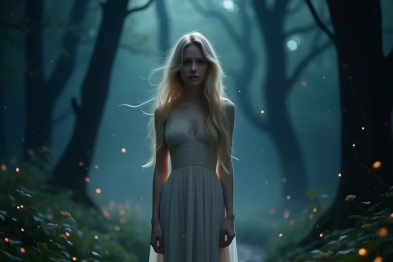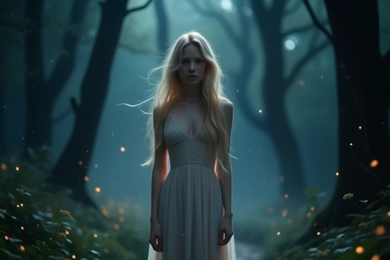 프롬프트: A beautiful, platinum-haired woman in a white dress slowly walks through the woods toward the camera. Around her, balls of golden-orange light float in the air.