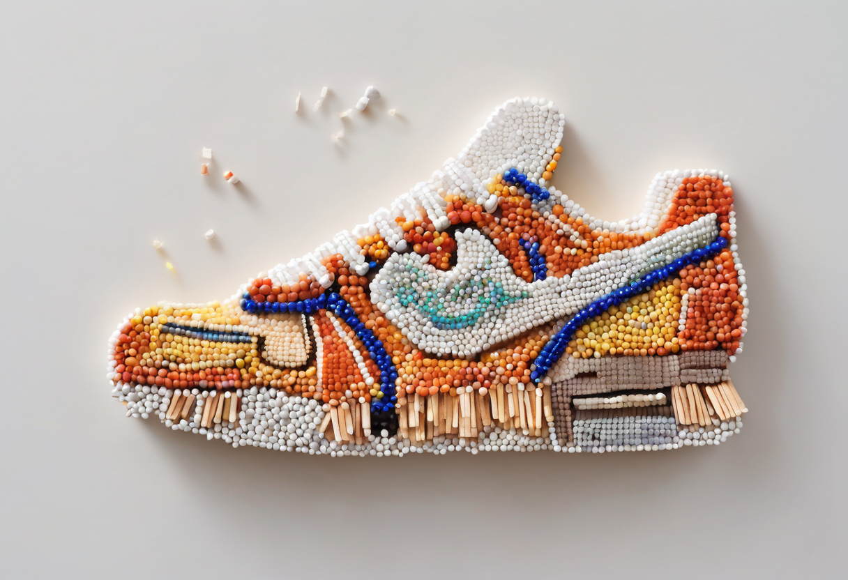 프롬프트: 2d match art, a sneaker made of matches and match beads on a white surface