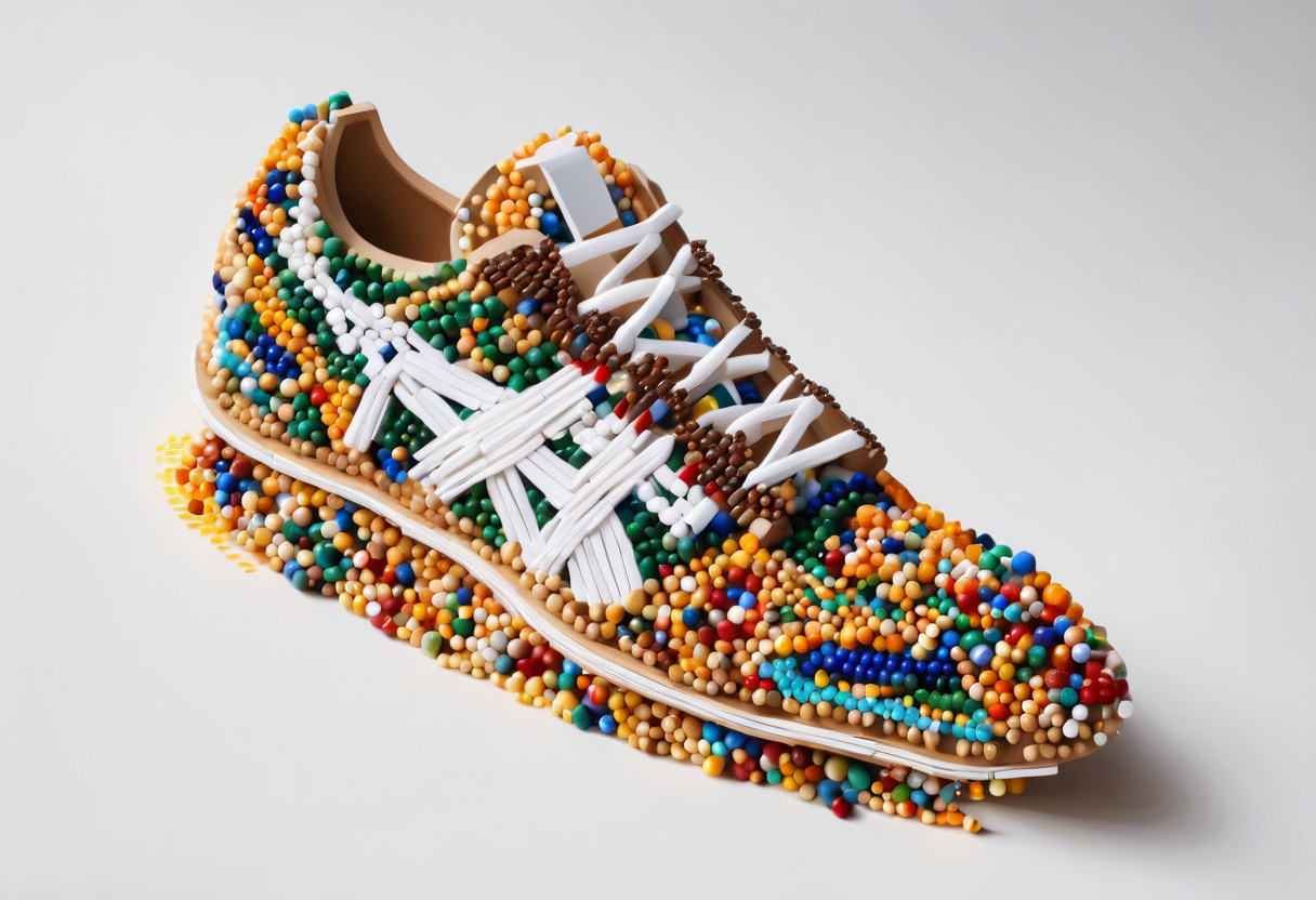 프롬프트: 2d match art, a sneaker made of matches and match beads on a white surface
