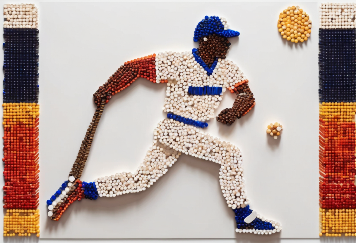 프롬프트: 2d match art, baseball player made of matches and match beads on a white surface