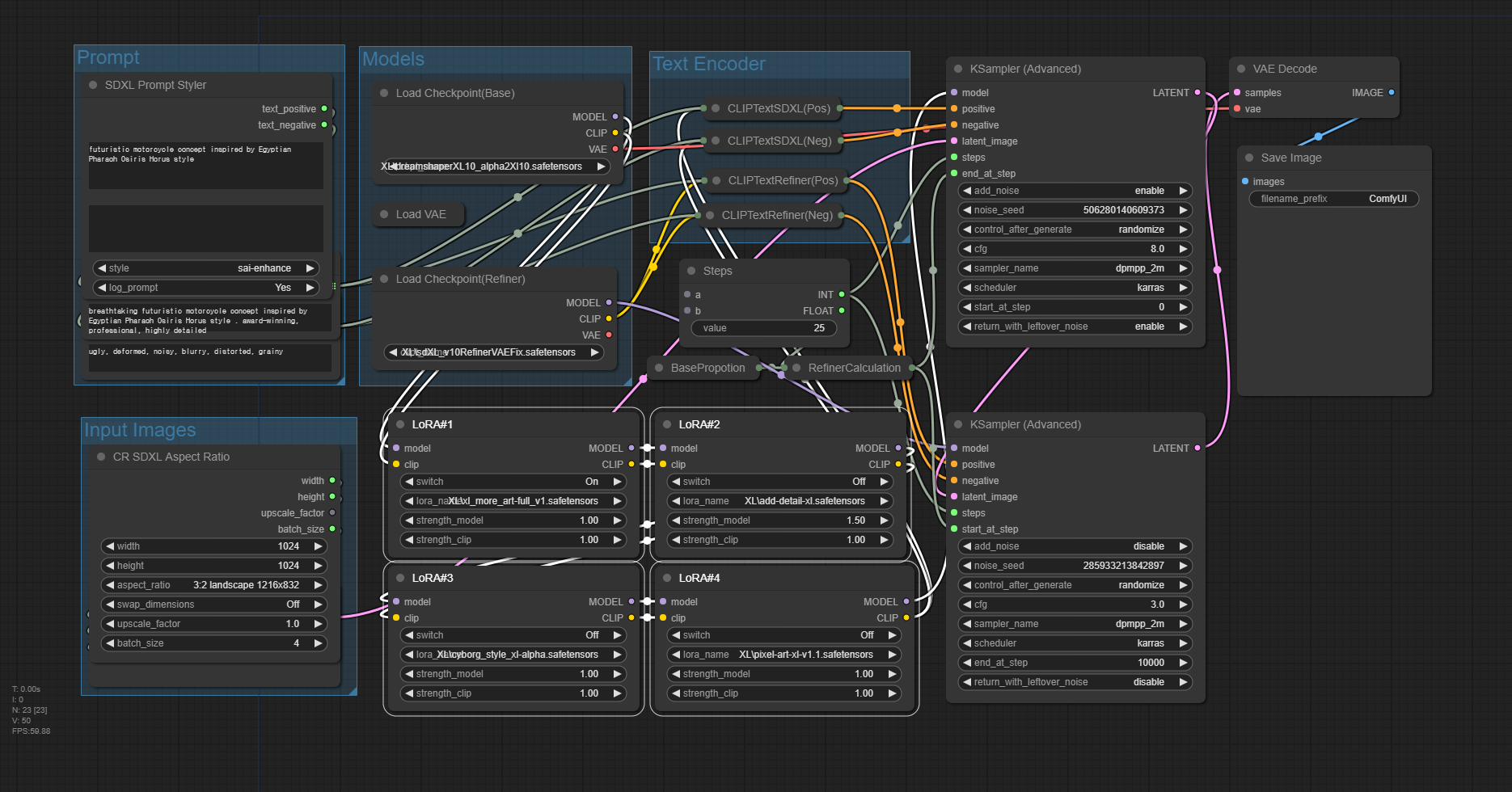 프롬프트는 아래와 같이 [SDXL Prompt Styler] 를 사용하여 생성합니다. 제가 입력하는 프롬프트와, 아래쪽에 있는 style 에서 지정하는 추가적인 (장식) 프롬프트를 결합하는 방식으로 작동합니다. 예를 들어 아래와 같이 프롬프트를 입력하고 스타일을 enhance로 지정하면 "breathtaking futuristic motorcycle concept inspired by Egyptian Pharaoh Osiris Horus style . award-winning, professional, highly detailed" 과 같이 프롬프트가 확장되고, 부정적 프롬프트는 "ugly, deformed, noisy, blurry, distorted, grainy"가 자동 추가됩니다. 자세한 내용은 이 글을 읽어보시면 됩니다.