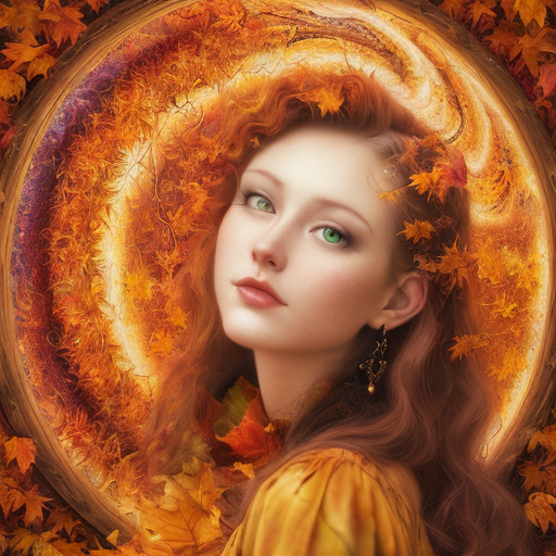 an oil painting of the autumnal equinox,a woman surrounded by autumn leaves, an airbrush painting by Josephine Wall, deviantart, psychedelic art, airbrush art, detailed painting, pre-raphaelite, 3d render, rococo art |