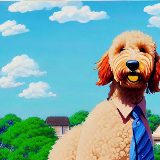 A painting of a cute goldendoodle in the sky, wearing a suit, natural light, with bright colors, by Studio Ghibli 프롬프트에서 "in the sky"를 앞쪽으로 옮겼더니 훨씬 나아졌음을 알 수 있다. |